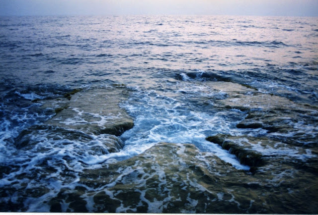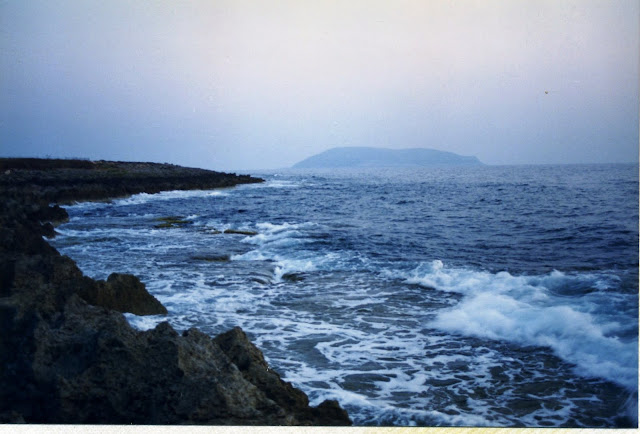 | Gli scogli davanti alla casa marina. Sullo sfondo l'isola di Proti. |