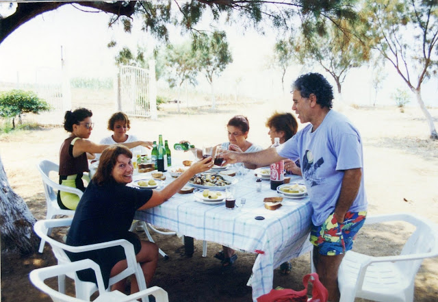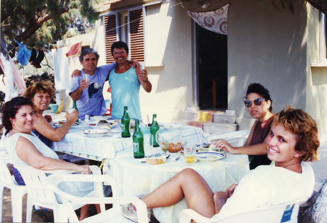 | Si brinda al pranzo davanti alla casa marina. Da sinistra: Mina, Kalliope, Agghelichì, Panaghiota, Aghela e Georghios. |