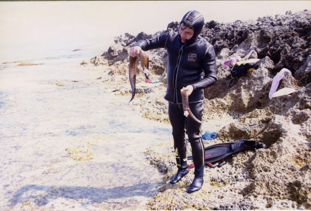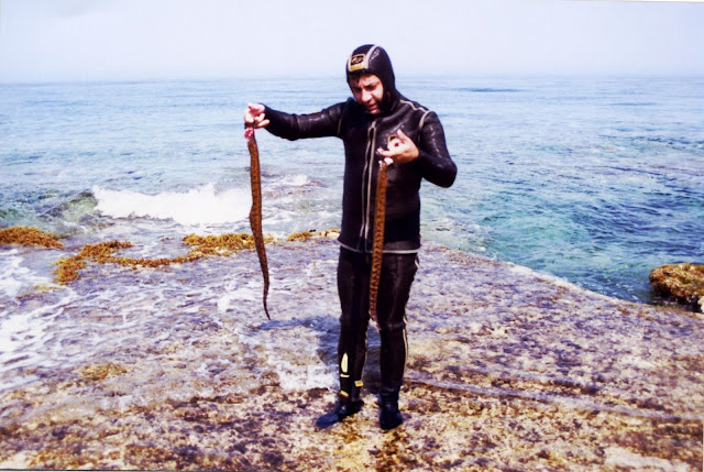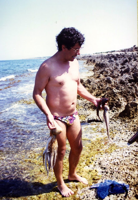 | Alfredo Romano, dopo la pesca subacquea, prepara il pranzetto. |