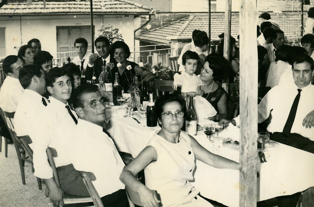 1970. Specchia in prov. di Lecce. Famiglie di salentini residenti a Civita Castellana invitate al matrimonio della figlia di Vittorio Placì (nella foto, l'uomo sulla destra che beve dalla bottiglia) il "caporale" che col suo Ford Transit, carico di salentini migranti, faceva la spola tra il Salento e Civita Castellana Riconoscibili, in senso orario: Osvaldo Placì, Angelo Romano, Lucia Giustizieri, Lucia Coluccia, Michela Maniglio (seminascosta), Giuseppe Romano, Luigi Giudice, Giovanni Romano, Vittorio Placì. A destra, Italia De Donati (moglie di Antonio D'Amelio, qui assente) con i suoi due figli.