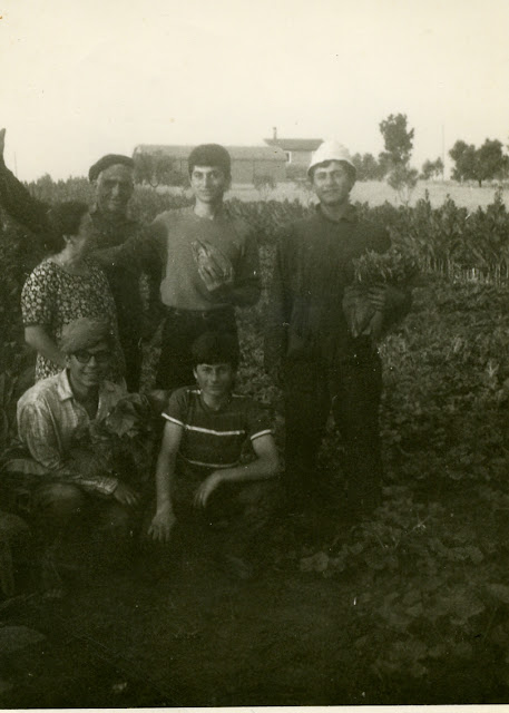 1974. Civita Castellana, loc. Terrano. Salentini coltivatori di tabacco. Da sinistra: mia madre Lucia, mio padre Giovanni, i coniugi Maria e Giuseppe Romano (cugino di papà) e ... Panico. In basso: un certo Maggio, capostipite dei tanti Maggio che stanno a Civita C., ...