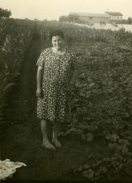 1969. Un secondo scatto a mamma mentre s'apprestava a pulire il pesce. 1969. Un terzo scatto a mamma sullo spiazzo davanti casa. Dietro, il capannone dove s'infilzavano le foglie di tabacco per farne dei "chiuppi", gruppi di corde di foglie da appendere sulla volta a essiccare.