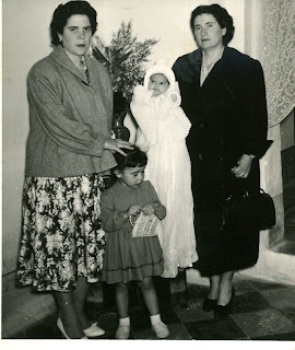 Collemeto 1965? Mia madre Lucia Giustizieri, madrina di battesimo, tiene in braccio Marisa Perrone, appena battezzata. Accanto a mamma, Iose Guagnano, madre di Marisa e di Lucia, l'altra bambina in piedi.