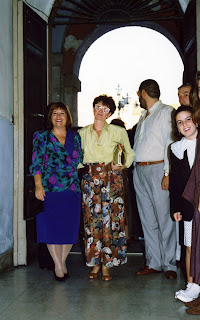 | Gli sposi Maria e Cesare. A sinistra, Mina Fabiani; dietro, Giuseppina Berto, Sergio Bertolini e Giampietro Cacchioli. Dietro gli sposi, la piccola Claudia Cacchioli e Miranda Berto |