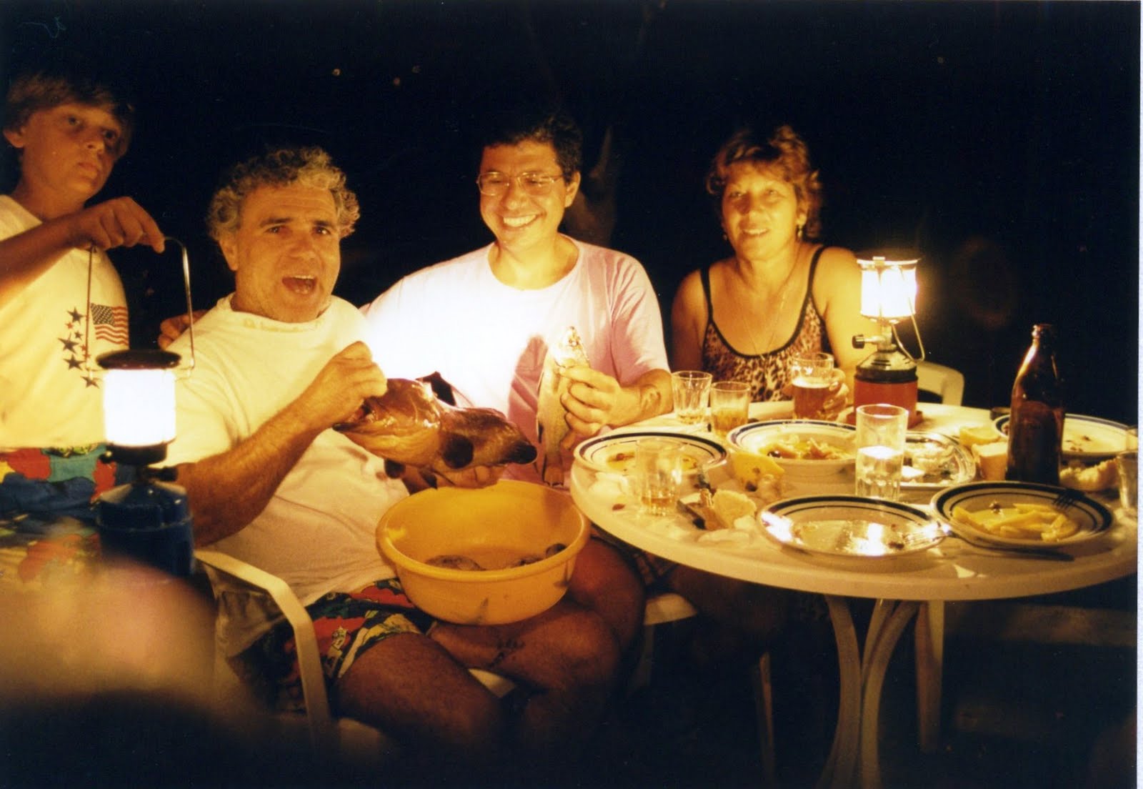 | Si cena sopo la pesca: Georghios, Alfredo e Aghela. |