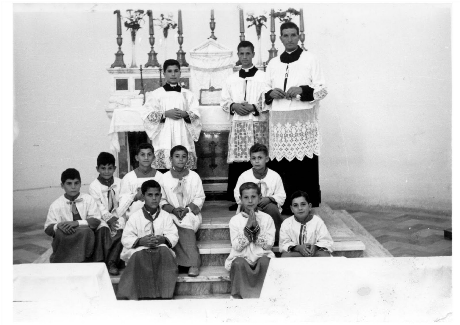 Collemeto, 1977. In chiesa. Don Cosimo Nestola, parroco di Collemeto e il cugino Alfredo Romano alla sua destra. |